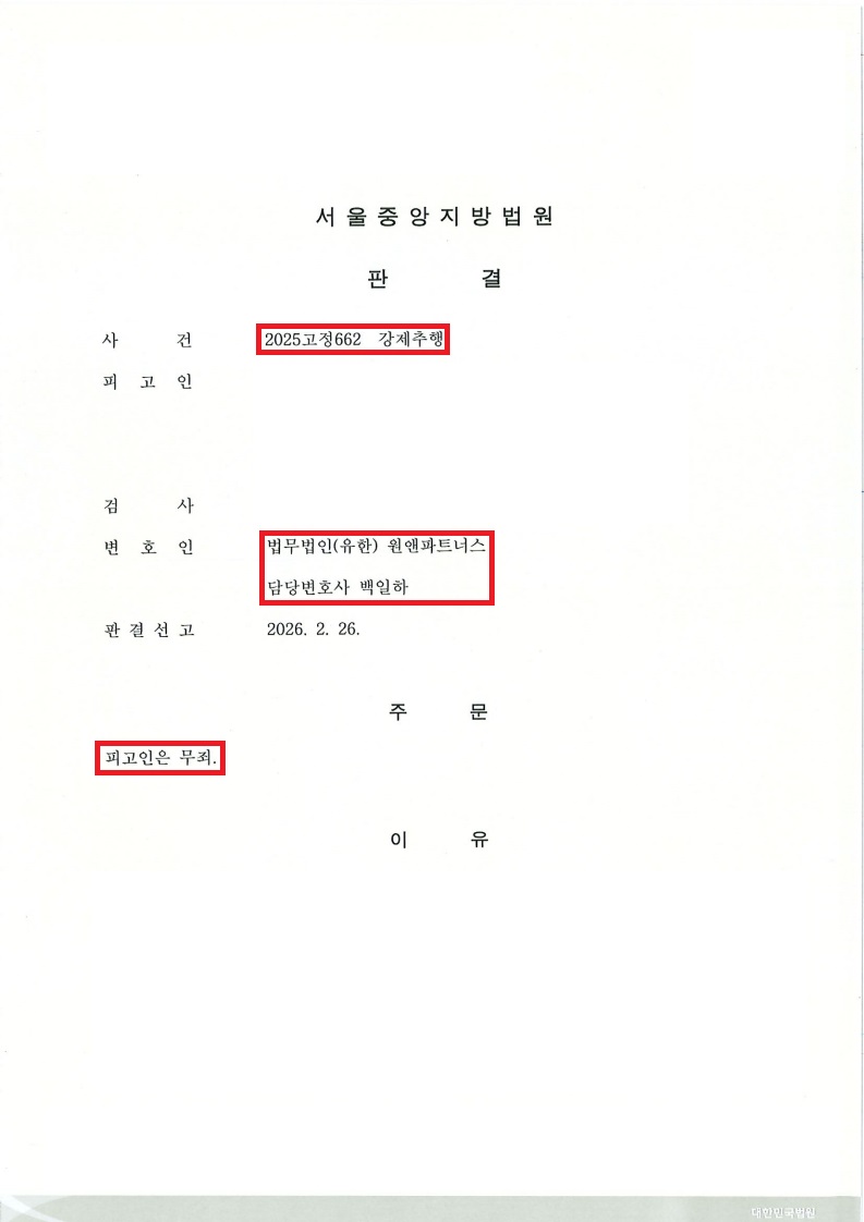 법무법인(유) 원앤파트너스는 강제추행 혐의로 기소된 피고인을 대리하여, 검사의 공소사실을 전면적으로 다툰 끝에 무죄 판결을 이끌어냈습니다.