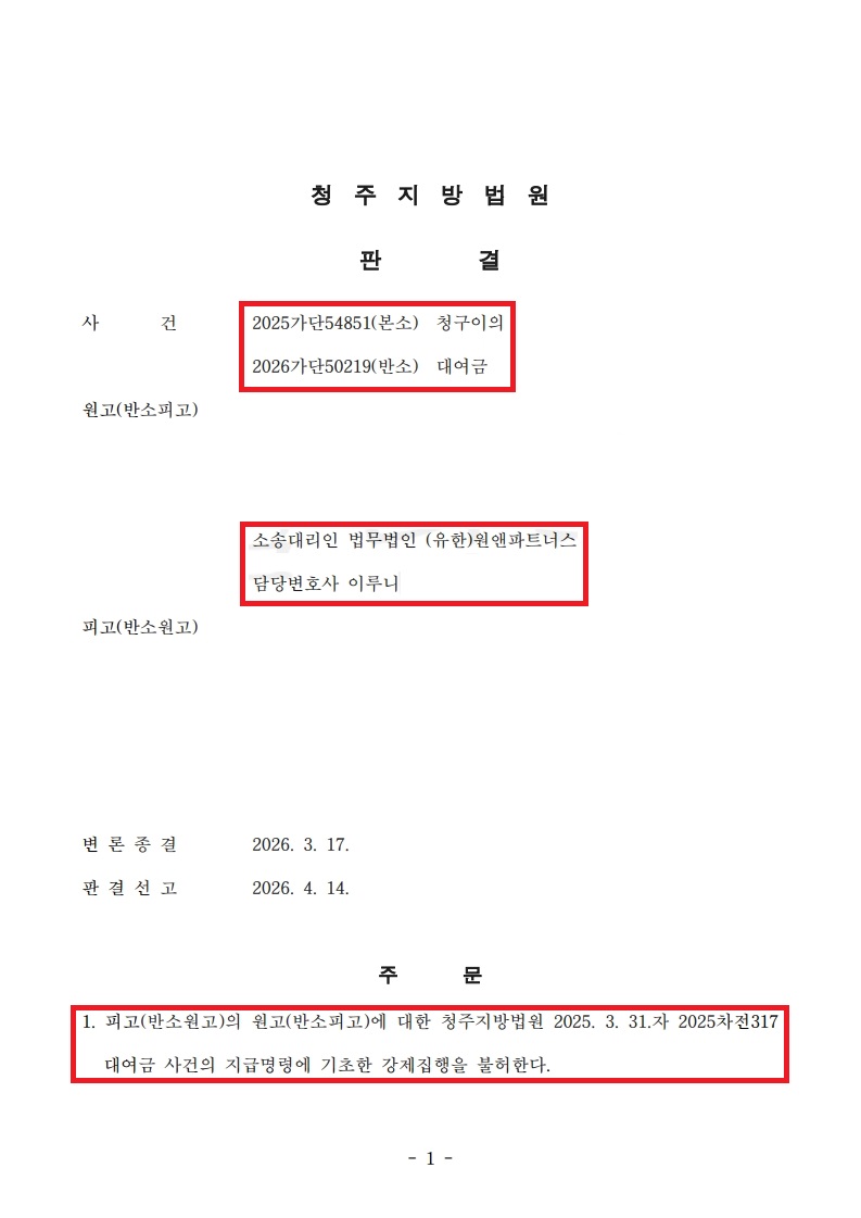 법무법인(유) 원앤파트너스는 대여금 지급명령에 기초해 부동산에 대한 강제집행(경매) 절차가 개시된 의뢰인을 대리하여, 해당 채무의 존재 자체를 다툰 끝에 강제집행 불허 및 상대방의 청구를 모두 기각시키는 판결을 이끌어냈습니다.
