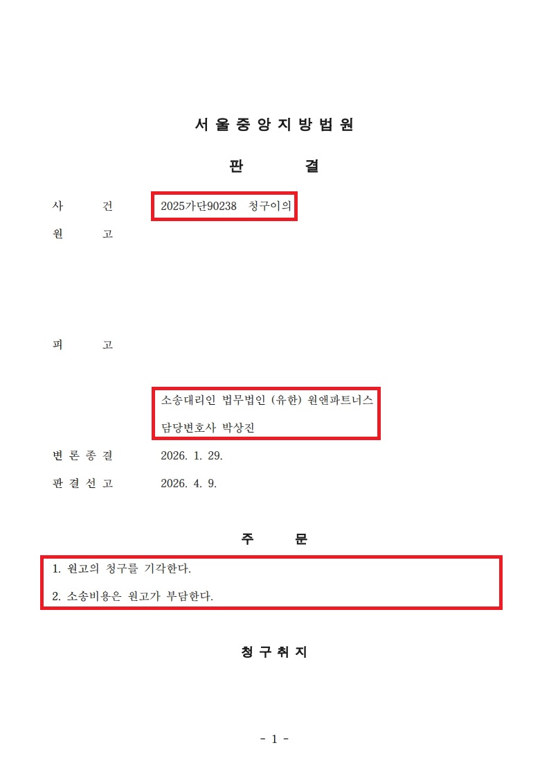 법무법인(유) 원앤파트너스의 의뢰인은 임대차계약상의 권리·의무를 포괄적으로 승계한 임대인으로서, 임차인이 임차료를 여러 차례 연체하자 화해조서를 토대로 임대차계약의 해지를 통보하고 강제집행(명도)을 진행하였습니다. 그런데, 임차인은 ‘화해조서 내용을 위반한 사실이 없고 설령 있더라도 의뢰인의 해지권은 소멸하였으며, 또한 임차인에게는 상가임대차보호법상 갱신청구권이 있으므로 의뢰인의 강제집행은 부적법하다’라고 주장하며 의뢰인을 상대로 청구이의의 소를 제기하였습니다.